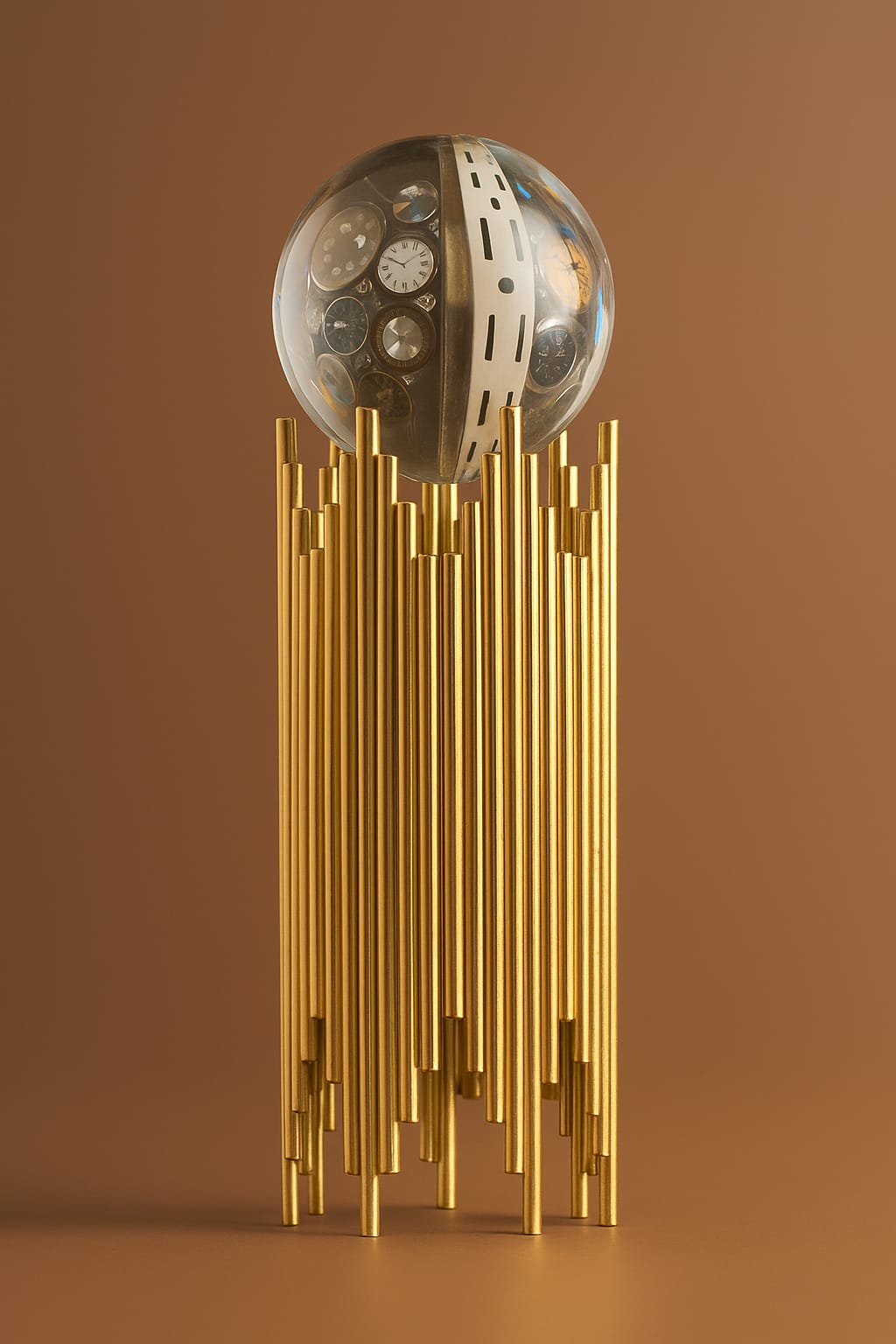 Modern Luxe Time Capsule Sculpture – Gold Metallic Art Piece with Spherical Clock Design